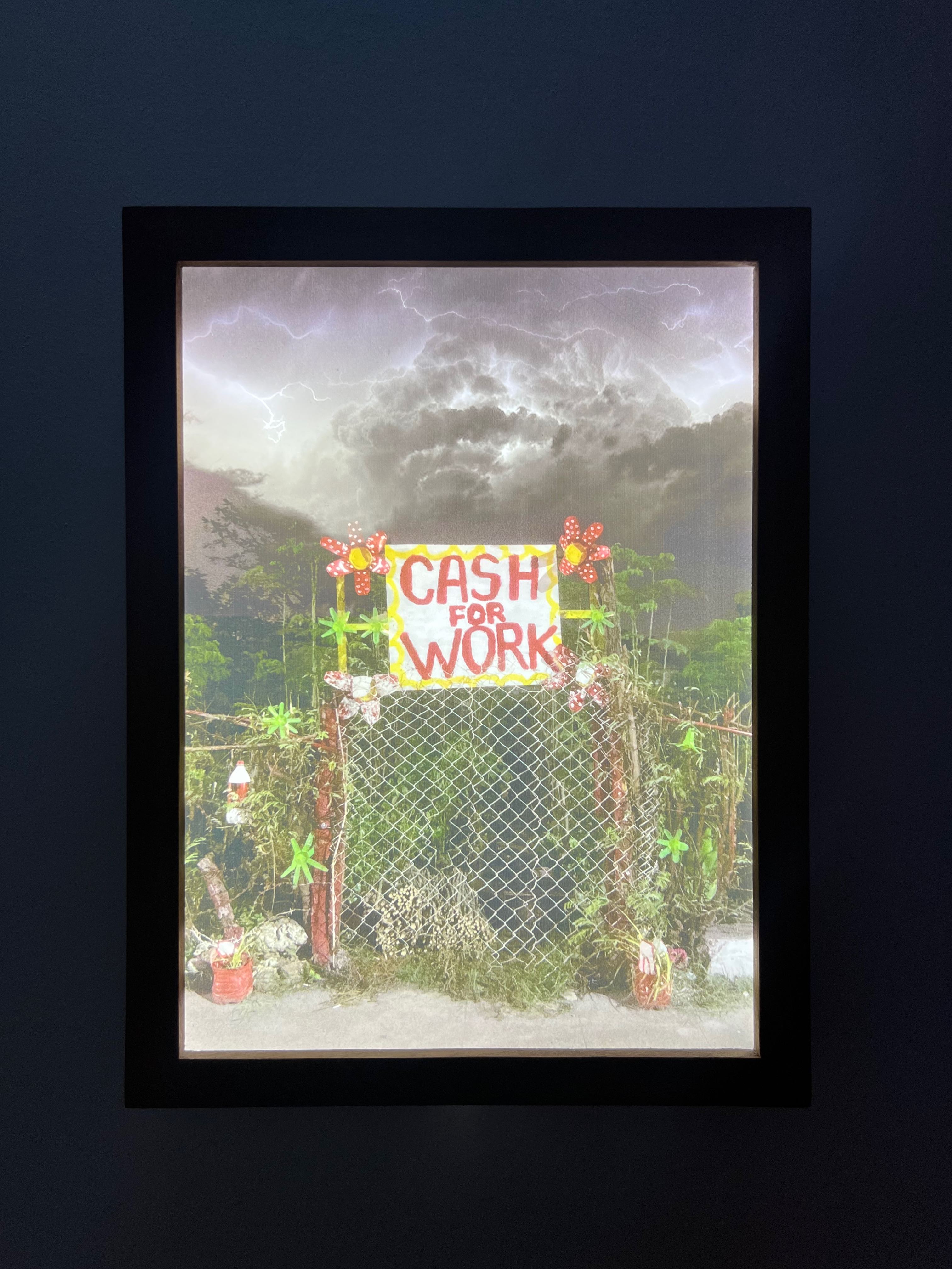 On the wall was a video showing a city on fire with a glowing pyramid in the background. It was mounted in a white box that made it look like the viewer was peering through the broken blinds of a high-rise window. On the opposite wall was a photograph depicting a forest or overgrown garden. Dark storm clouds and bolts of lightning loomed above. At the foreground of the image was a fence with bright plastic flowers and cans repurposed into plant pots. A hand-written sign reading Cash For Work was attached to the top of the fence.