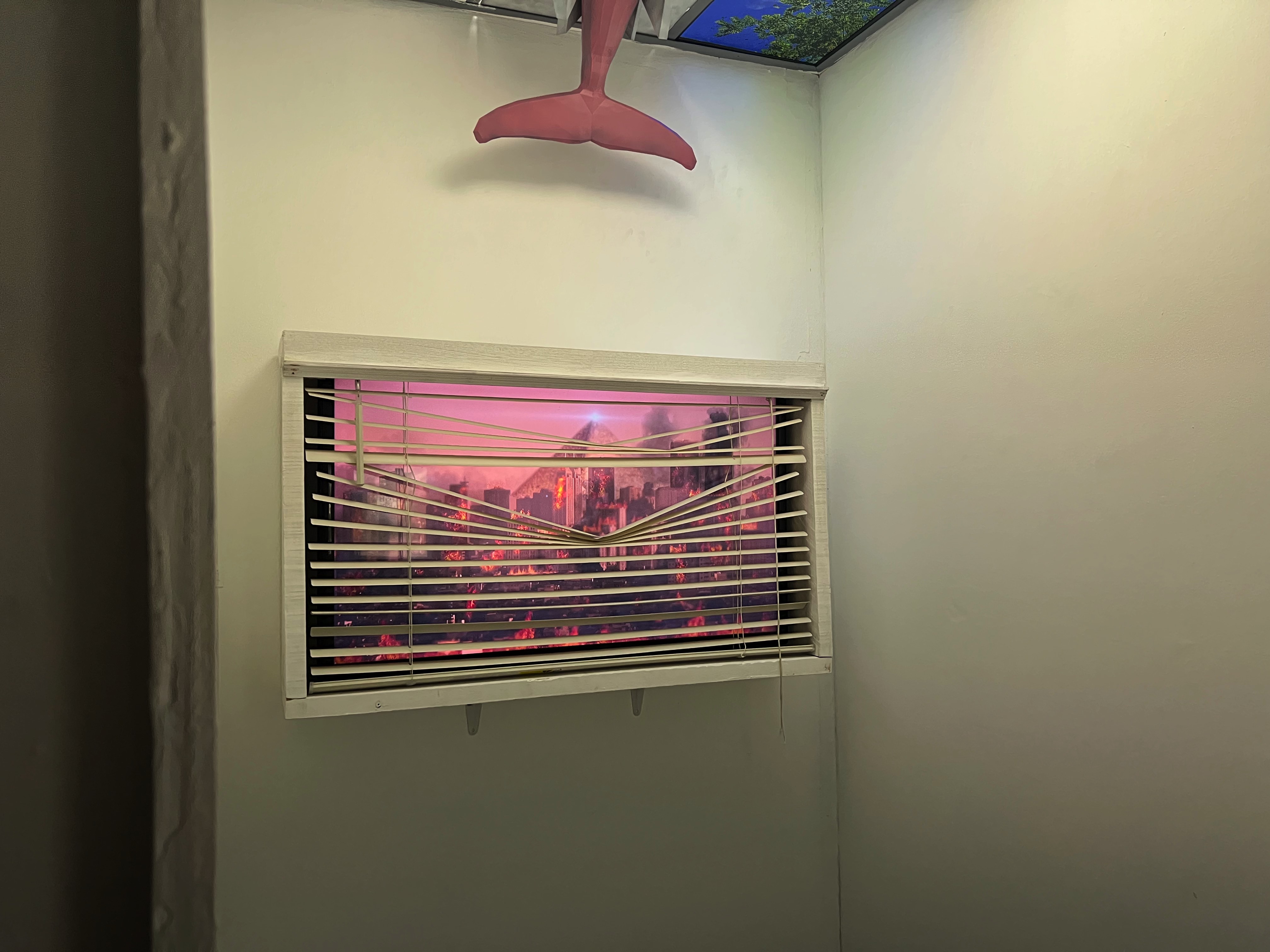 It was a strange, unsettling experience. The tight space made the exhibition feel more immersive, as you were trapped inside and couldn’t distance yourself from the installations. It felt like you were watching the city burn through a window, helpless to stop it. Meanwhile, a dolphin hovered in mid-air, as if falling from the sky. It evoked the sensation of a surreal, alien apocalypse.